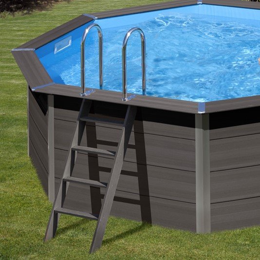 Queste piscine in WPC fuori terra sono fornite in kit completi di tutti gli elementi necessari al montaggio, compresi gruppo filtrante monoblocco a sabbia, skimmer e bocchette e tappetino di fondo antibatterico.